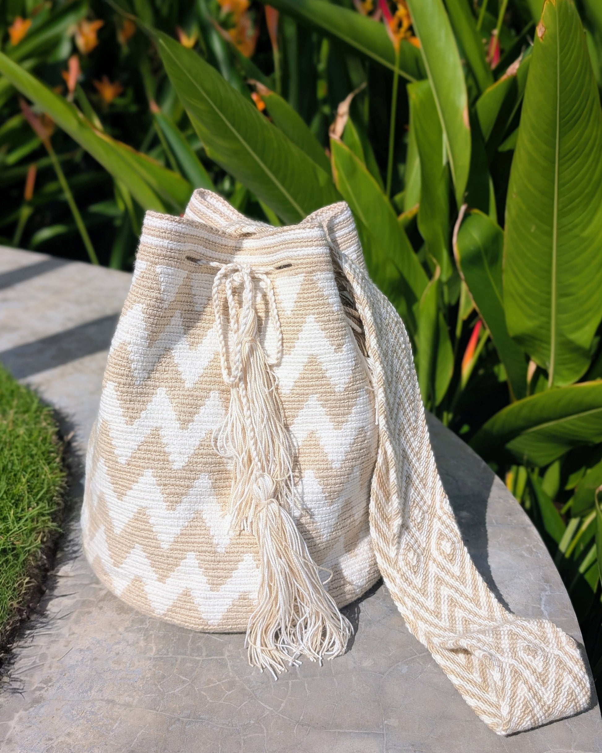 Soft light, quiet strength. Ceniza Clara embodies purity and calm through its gentle beige and ivory tones — a reflection of natural beauty and refined craftsmanship. Each handwoven detail tells a story of patience and artistry, preserving the timeless weaving tradition of the Indigenous Wayuu community in Colombia.