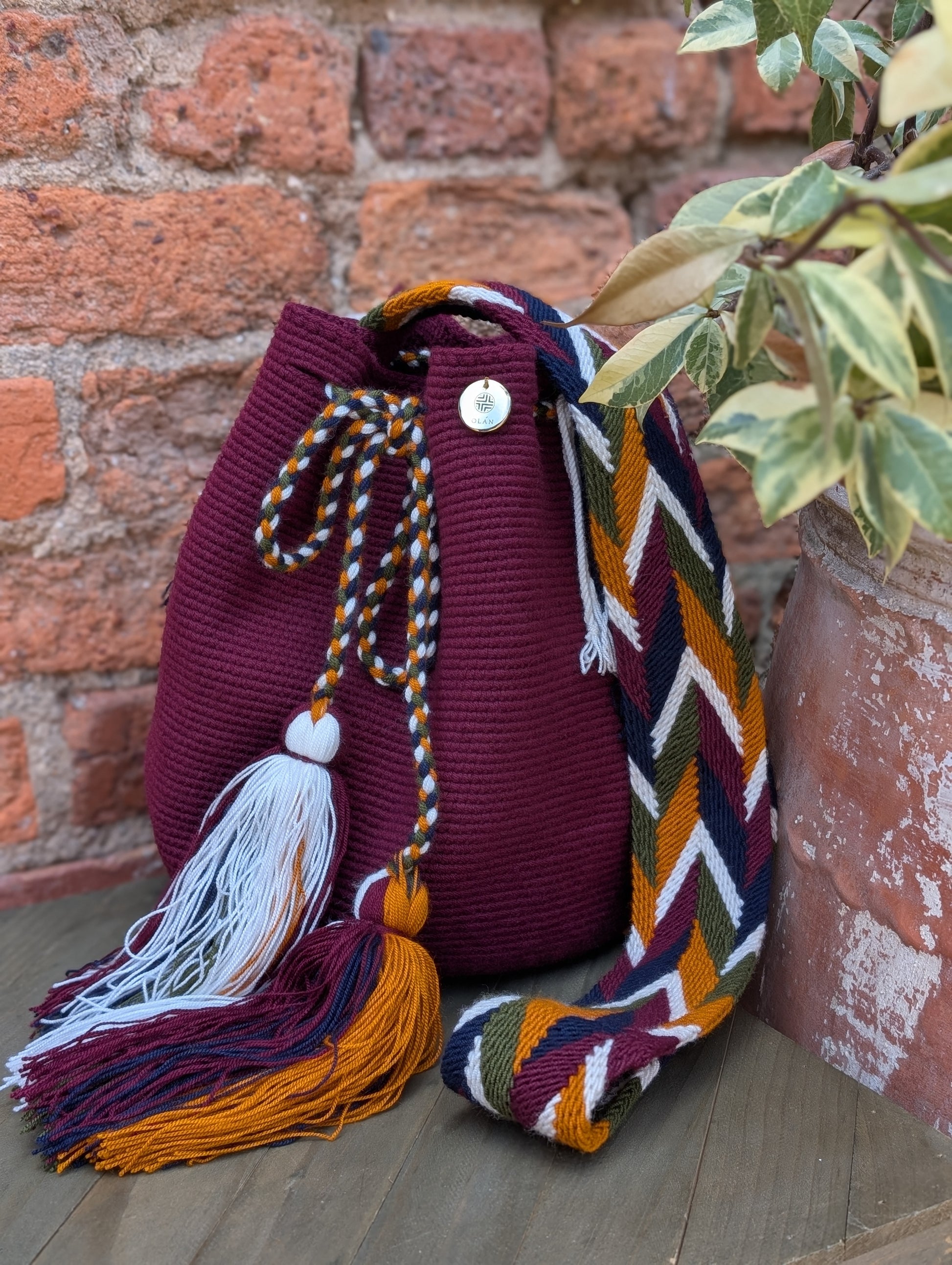 Deep, warm, and elegant — Ciruela captures the richness of a late harvest. Its plum-toned body is paired with an earthy chevron strap woven in forest green, golden ochre, ivory, and navy. The flowing tassels echo the full palette, adding texture and movement to this timeless design.