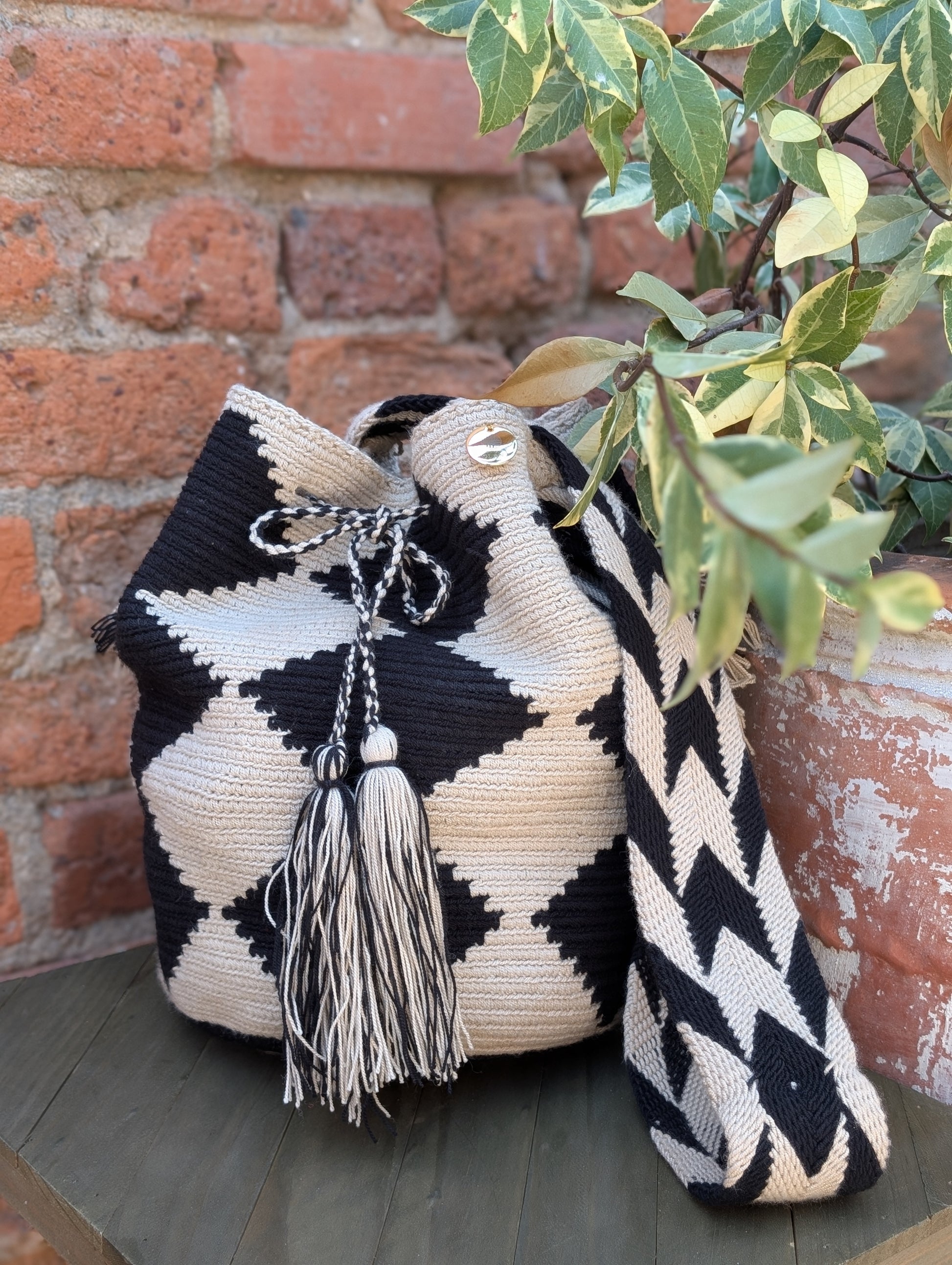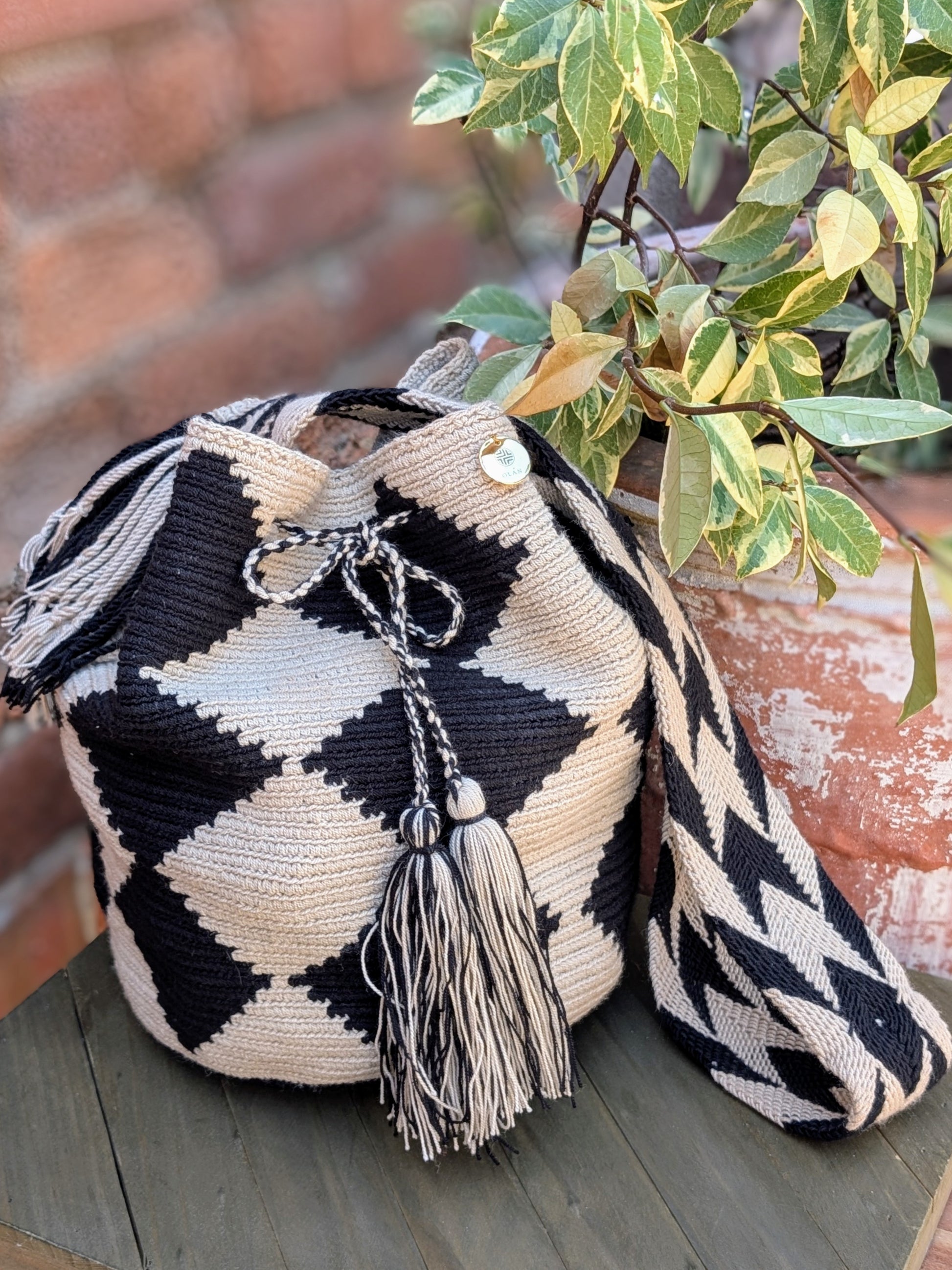 La Negra features a bold black-and-beige geometric pattern that commands attention without saying a word. With a thick, handwoven strap and statement tassels, this mochila is made for all-day wear and everyday style.