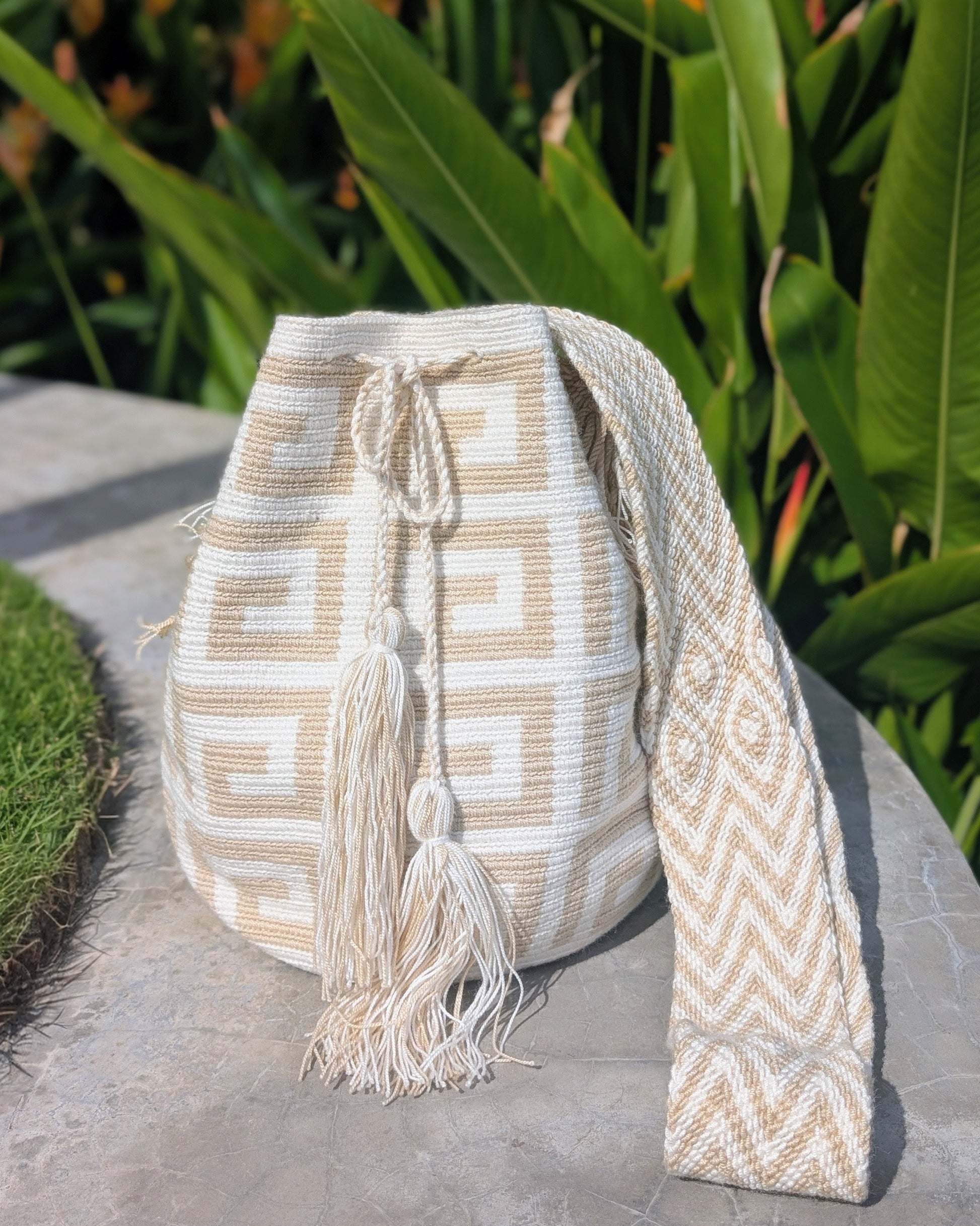 Soft tones and timeless artistry come together in Myra. Inspired by natural elegance and coastal calm, this beige-and-ivory Wayuu bag evokes the warmth of sunlight and the beauty of handcrafted detail. Its geometric pattern reflects the balance and harmony woven into every creation by the Wayuu artisans of Colombia.