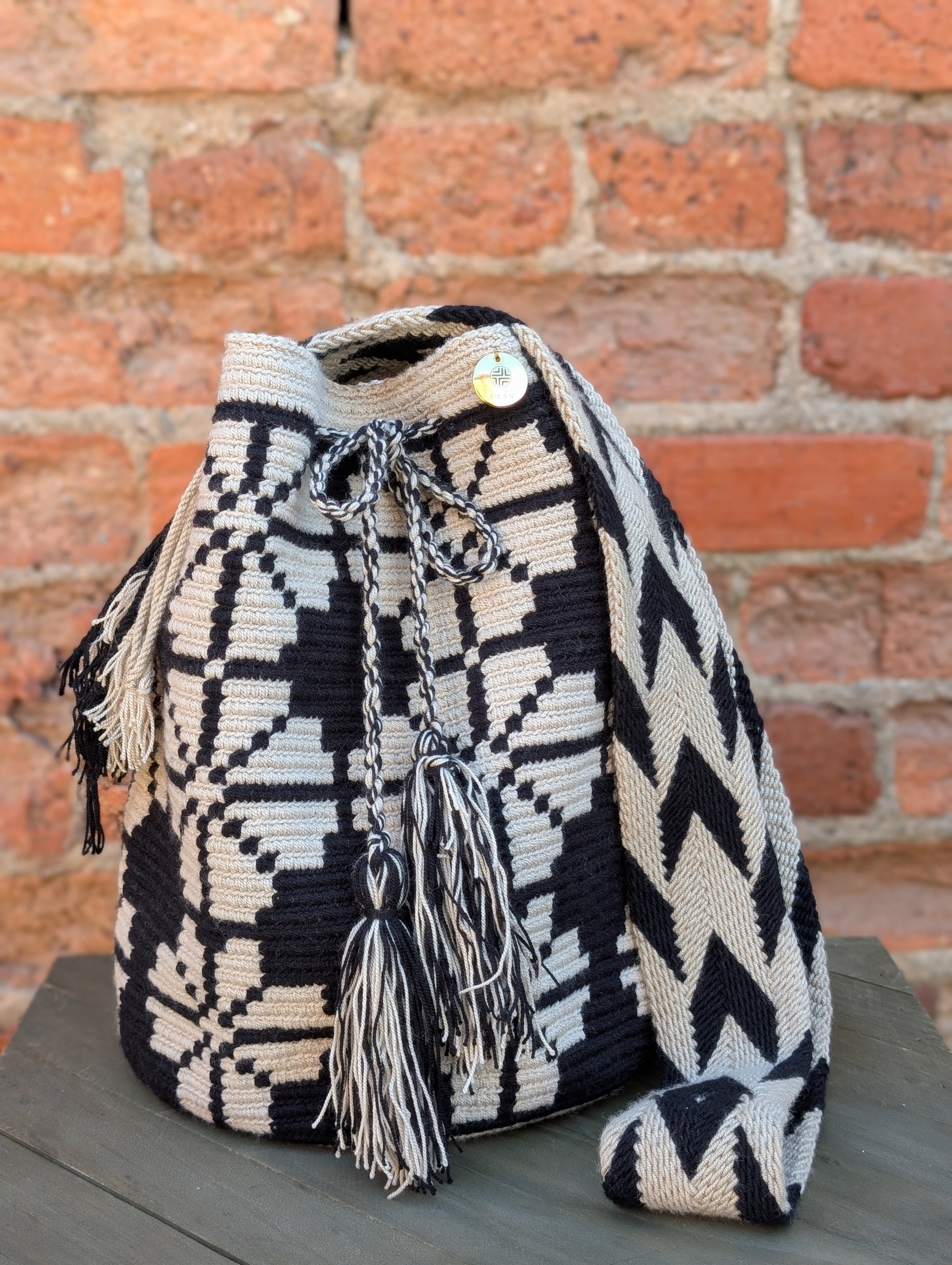 Bold in contrast, rich in tradition — Noche Clara is a monochrome masterpiece. The intricate black and beige pattern evokes the quiet strength of a clear night sky, while the chevron strap and tassels add movement and detail.