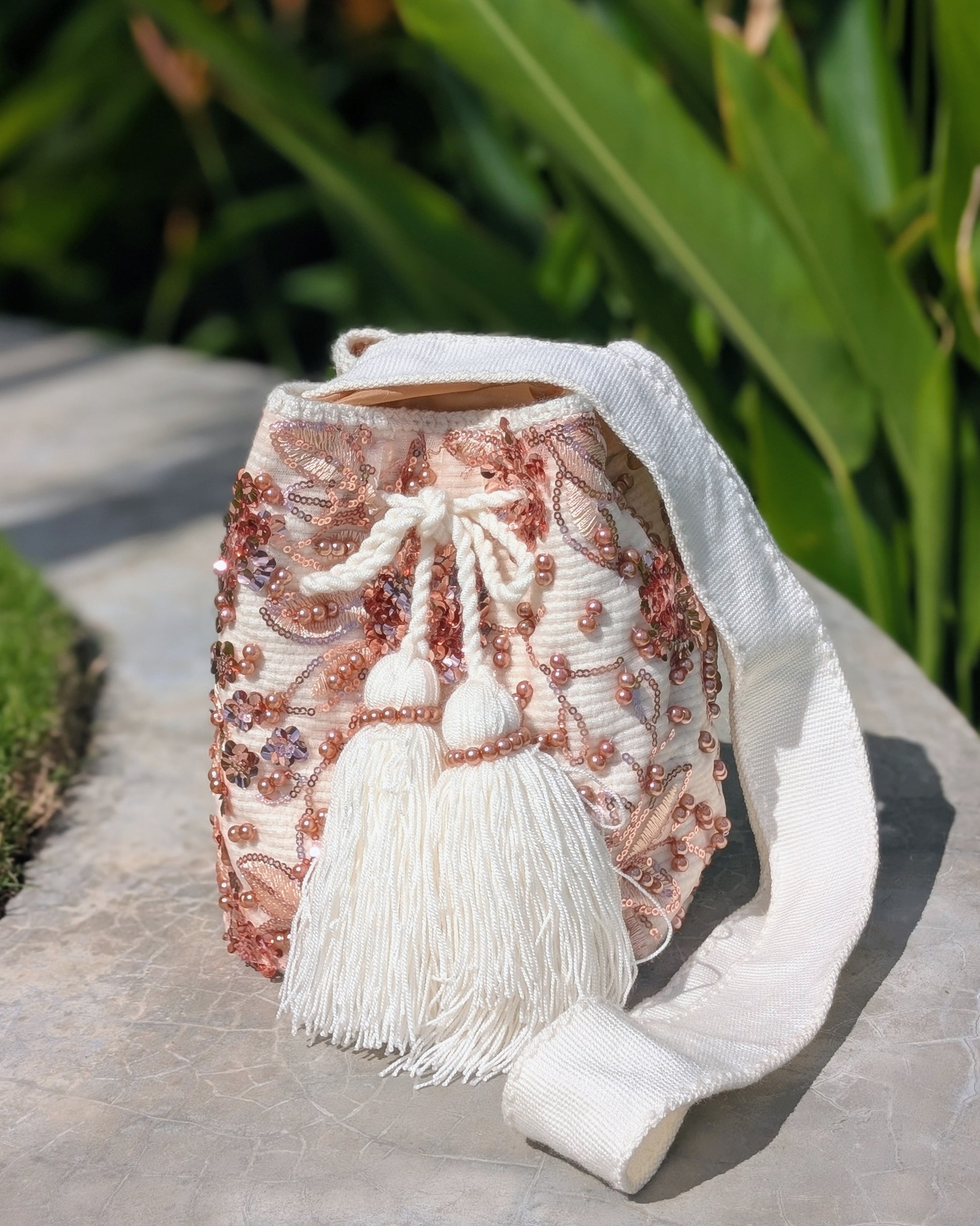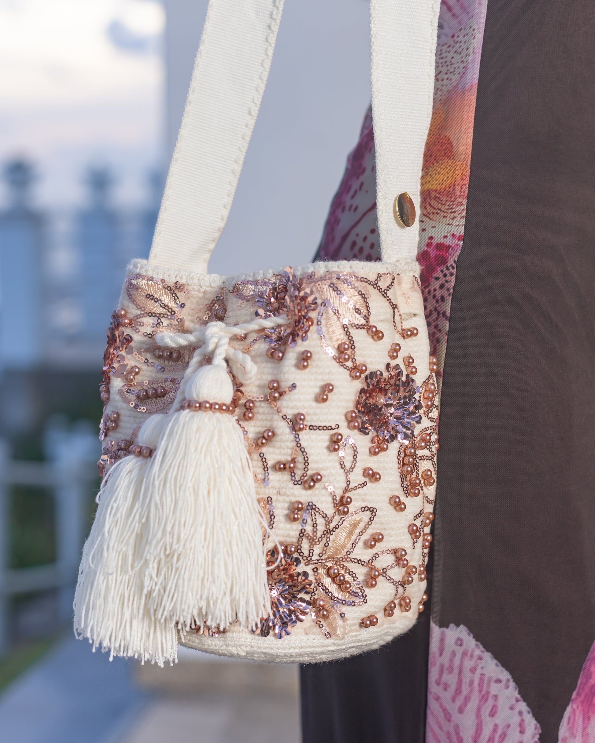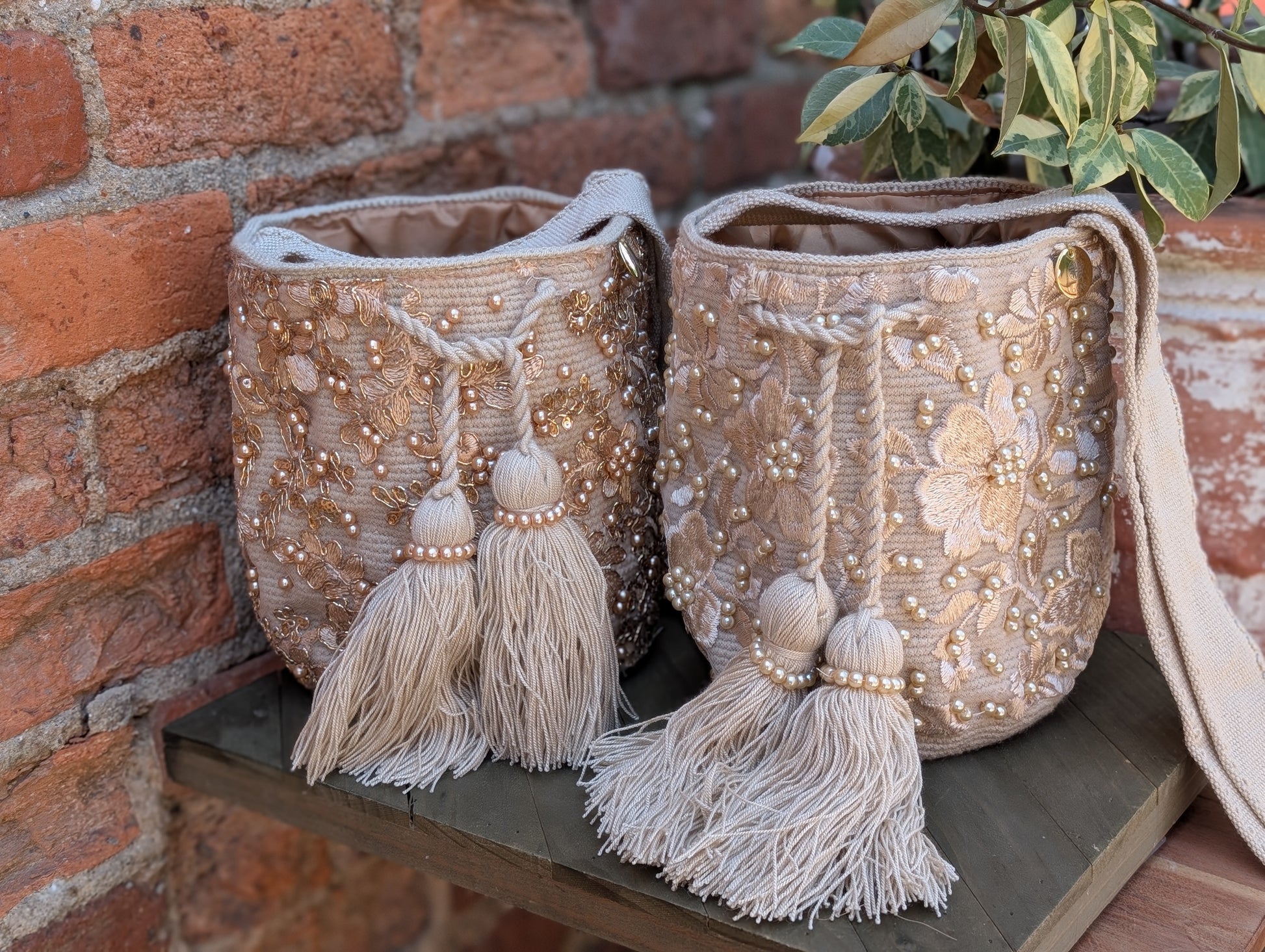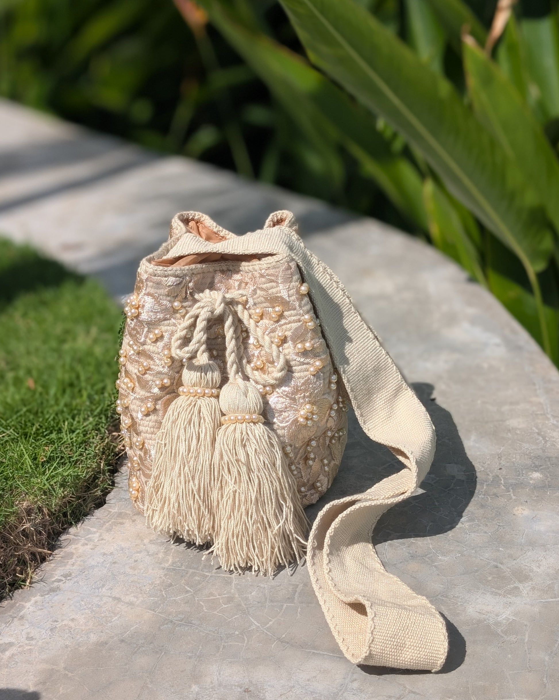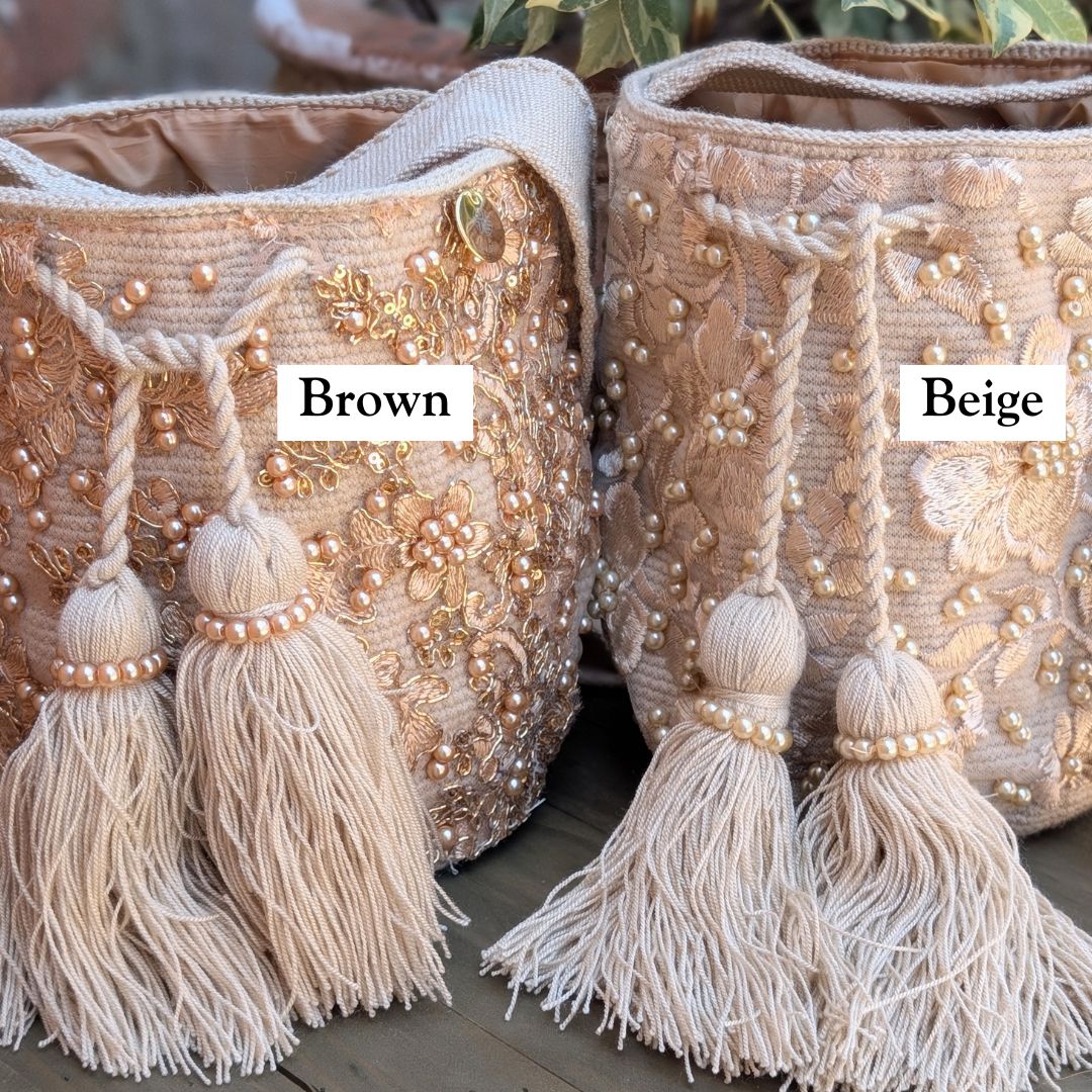Meticulously hand-embellished with floral embroidery and soft pearl accents, Perla is an ode to refined craftsmanship and timeless beauty. From its golden-beige body to its dramatic tassels wrapped in pearl strands, every detail celebrates feminine artistry and heritage. Lined for practicality and elevated in every way, this piece transitions effortlessly from day to night.