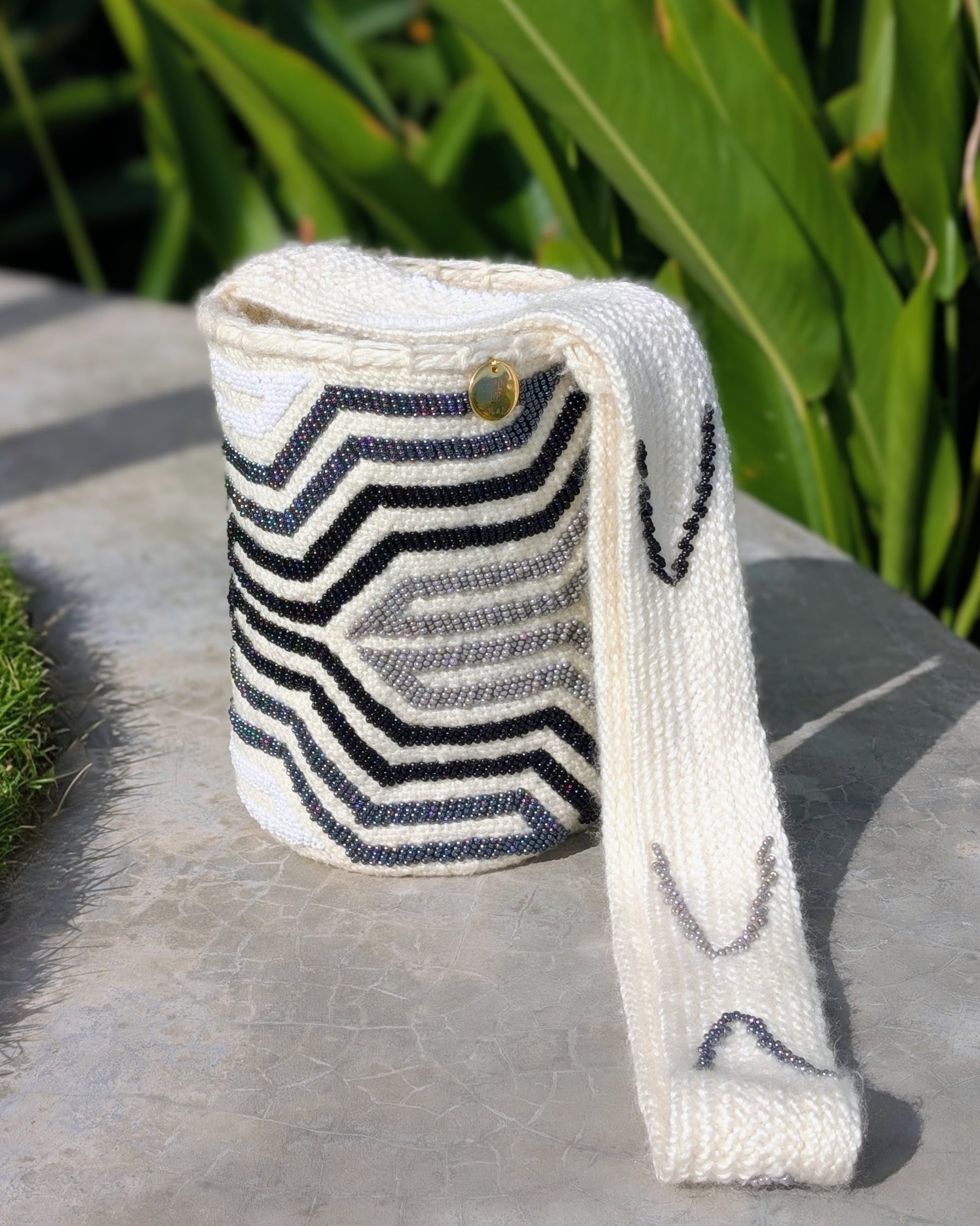 Refined elegance, illuminated through craftsmanship. Véla captures the harmony of light and form — handwoven in ivory tones and detailed with intricate black beading that shimmers softly with every movement. Each pattern is a testament to the precision and artistry of the Wayuu women of Colombia, whose weaving traditions embody patience and purpose.